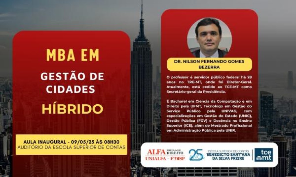 O Tribunal de Contas de Mato Grosso (TCE-MT), em parceria com a Fadisp, promove o quarto módulo do MBA em Gestão de Cidades nesta sexta-feira (30), das 8h30 às 13h30, no auditório da Escola Superior de Contas. Com o tema Nova Lei de Licitações, a aula será ministrada pelo secretário-geral da Presidência do TCE-MT, professor e servidor público federal, Nilson Fernando Gomes Bezerra.