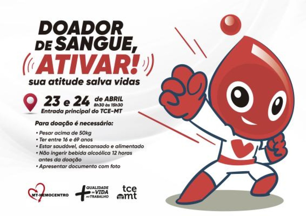 A Secretaria Executiva de Gestão de Pessoas do Tribunal de Contas de Mato Grosso (TCE-MT), por meio do Núcleo de Qualidade de Vida no Trabalho, realiza a primeira campanha de doação de sangue de 2025, das 8h30 às 15h30 desta quarta (23) e quinta-feira (24). Fruto de parceria com o MT-Hemocentro, a ação tem por objetivo contribuir com o abastecimento do estoque do único banco de sangue público de Mato Grosso.