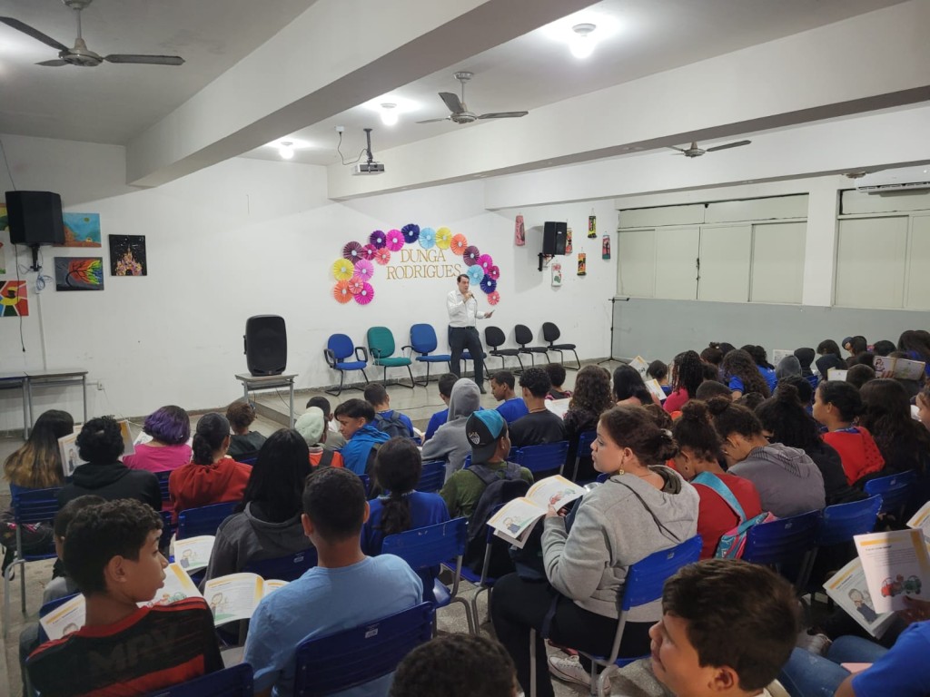 Esta matéria possui recursos de texto alternativo para promover a inclusão das pessoas com deficiência visual. Descrição da imagem: Dezenas de estudantes sentados no auditório da escola participam da palestra proferida pelo servidor do TJMT, que está no palco, falando ao microfone. Ao fundo do palco, uma parede branca com cadeiras, caixa de som, flores de papel colorido, o nome da escola Dunga Rodrigues feito em papel dourado, pinturas em quadros.